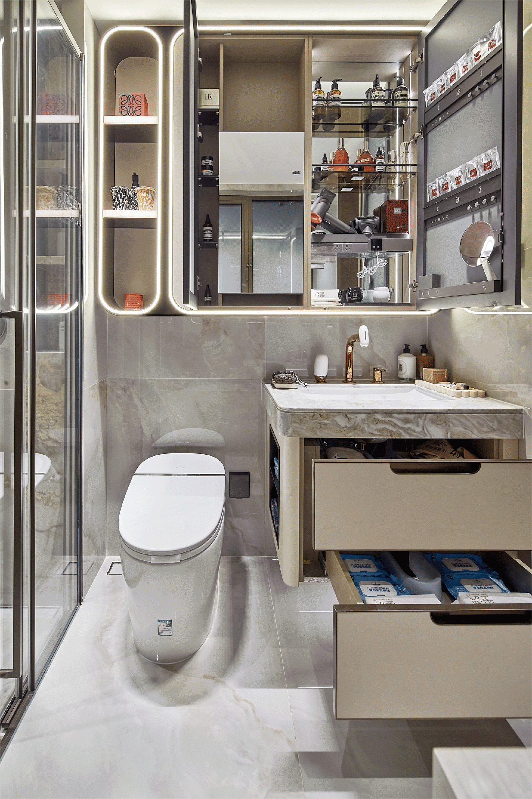保利天奕特别关注到女性的生活需求,专门在卫生间配备了美妆龙头、美妆镜柜、美妆冰箱,采用“顶+面双补光照明”,能把“女本位”需求做到如此细致,目前没有几个项目能做到!