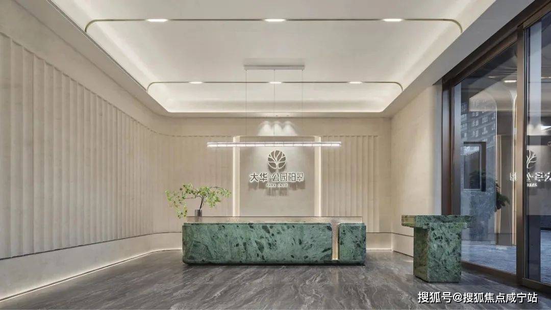 大华公园柏翠售楼处电话:✅︎✅︎✅大堂接待台选用产自意大利山脉的宝格绿奢石一体打造而成。
