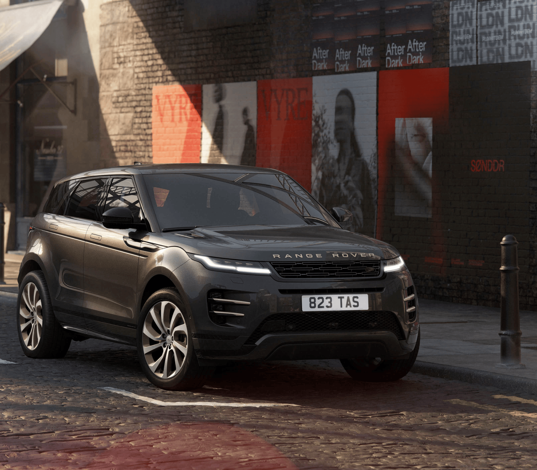 在最直观的颜值设计层面,路虎揽胜极光Hoxton融入了伦敦潮流街区的设计理念,整个车头十分圆润,给人一种虎头虎脑的感觉。蚌壳式的前舱盖正前方配备了银色金属的“RANGE ROVER”英文车标,扁平化的U字形格栅搭配着参数化的镂空中网,两侧依旧是天使之眼前大灯设计,内部融入了L型LED日行灯、矩阵式LED远近光光源,科技感十足。前保险杠两侧配备了左右对称式的大尺寸导流槽和双横幅式的银色风刃,中间配备了两个对置的梯形进气口,还有上翘的金属防撞梁,造型依旧经典。车尾轮廓较为方正,配备了向后延伸出的后扰流板和隐藏式高位刹车灯,下方配备了恶魔之眼尾灯设计,熏黑的灯罩内部融入了扁平的U字形红色光源,提高了夜间辨识度。夸张的后包围搭配着双边双出的金属排气,增添了更多的运动气息。