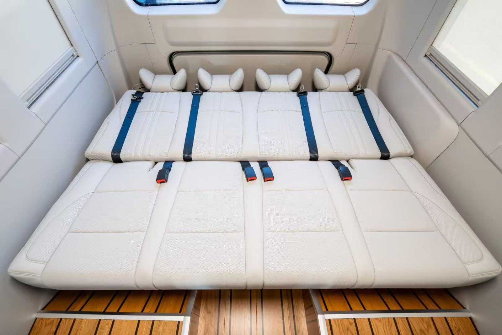 红旗国悦长宽高分别为7295/2090/2785,2695mm,轴距为3990mm,侧面使用较为常见的中巴客车车身结构,厢式车身配合单幅电动门,同时还配有副驾驶门,且可选装双色车身。 配置较为丰富,全系标配LED前后灯组及LED日间行车灯、侧转向灯、后雾灯、牌照灯、高位制动灯、外后视镜电动调节/加热、前风挡除霜、前风挡间歇式雨刮器、司机/副驾驶侧声学玻璃、钢化隐私玻璃、安全天窗(低透光/不可开启)等。 旗舰版第二排座椅还带有办公桌、杯架、220V电源、车载冰箱、隐藏式雨伞架、空气净化器等。