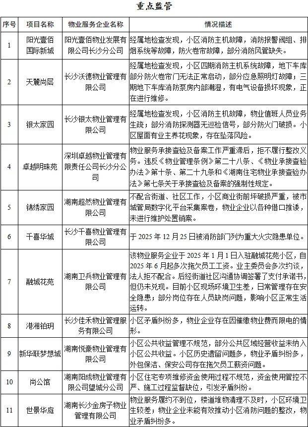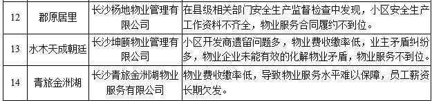 另,湖南鑫馨物业管理有限公司(新芙蓉之都佳苑)因“物业服务企业对高层建筑重大火灾风险隐患排查工作配合不力,街道、社区工作人员多次沟通提醒,企业仍未按时完成相关信息报送工作”等原因被列入“黑榜”。长沙市恒耀物业管理有限公司(尚城)因“小区消防整改工作滞后,物业公司欠缴水费问题突出,物业矛盾纠纷频发,物业服务严重不达标”等原因被列入“黑榜”。长沙新里物业服务有限公司宁乡分公司(绿地·中央花园)因“业主大会决定更换物业服务企业,该物业服务企业未依照《中华人民共和国民法典》第九百四十六条、第九百四十八条规定履行合同义务,单方面提出直接退场;不配合开展企业进退交接工作,影响小区正常运转;该物业公司目前存在欠薪问题”等原因被列入“黑榜”。