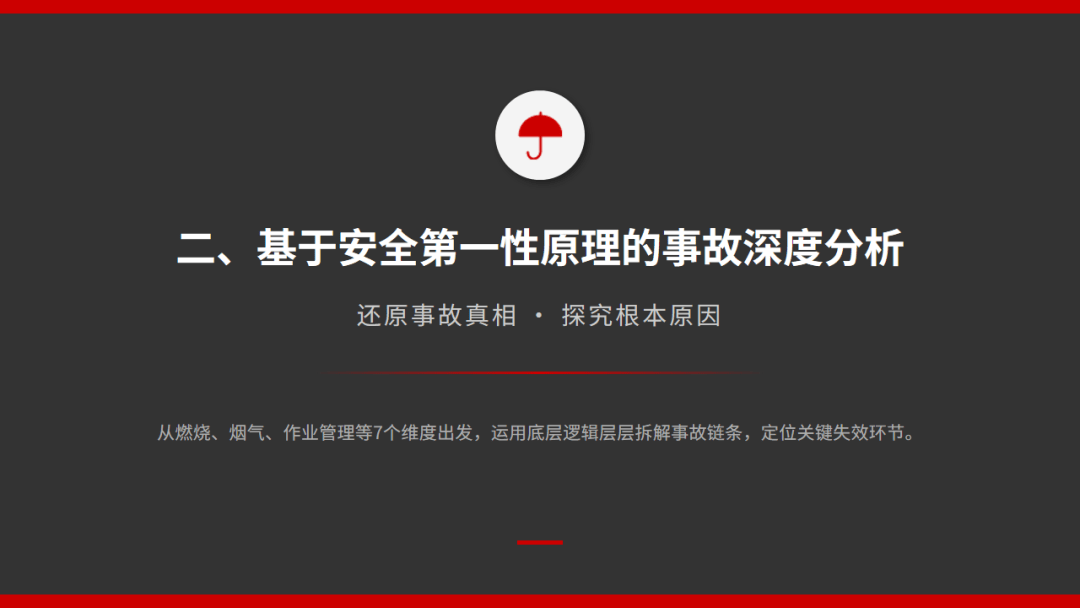 接下来,我们将进入本次报告的核心部分。我们将运用安全第一性原理,从最基本的物理和管理规律出发,一步步剖析这起事故是如何发生的,探究其背后的根本原因。我们将从燃烧、烟气、作业管理等七个方面进行深度分析。
