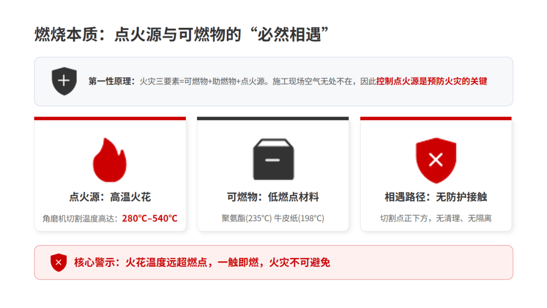 我们首先来看燃烧的本质。根据火灾三要素原理,可燃物、助燃物和点火源缺一不可。在建筑施工现场,空气和各类可燃物几乎是无处不在的,因此,控制点火源就成了预防火灾的重中之重。在这起事故中,点火源是切割作业产生的高达540℃的火花,而可燃物是引燃温度仅235℃的聚氨酯泡沫和198℃的牛皮纸。当高温火花直接接触到这些低燃点的可燃物时,火灾的发生就成了必然。