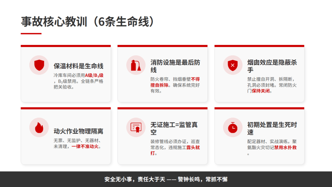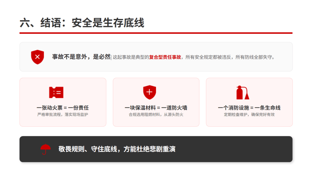 这六条教训,每一条都对应着事故中的一个关键错误。第一,保温材料的燃烧性能是生命线,绝不能降级使用。第二,消防设施是最后一道防线,绝对破坏不得。第三,必须严控烟囱效应,防止烟气快速蔓延。第四,动火作业的物理隔离是不可逾越的底线。第五,必须严查无证施工,杜绝监管真空。第六,必须提升初期火灾处置能力,抓住生死时速。这六条教训,我们必须时刻铭记。