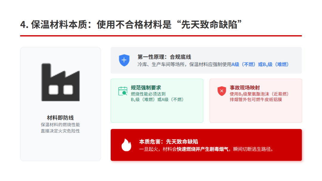 建筑材料的选择,直接决定了火灾的危险性。根据国家规范,像冷库、生产车间这类场所,保温材料必须使用难燃或不燃的A级或B1级材料。然而,事故公司却使用了可燃的B2级聚氨酯泡沫,这本身就是一个致命的先天缺陷。这种材料一旦被引燃,不仅燃烧速度极快,还会产生大量剧毒烟气,为后续的惨重伤亡埋下了伏笔。
