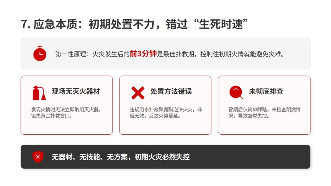 火灾初期的处置能力,直接决定了事故的最终走向。黄金3分钟内,如果能够有效扑救,就能将损失降到最低。但在这起事故中,我们看到的是应急能力的全面缺失:现场没有配备灭火器材,作业人员缺乏基本的消防知识,用无效的方式(脚踩、用水)去处理火情,并且在发现初期冒烟后没有进行彻底排查。这一系列错误的处置,最终导致了火势的完全失控。