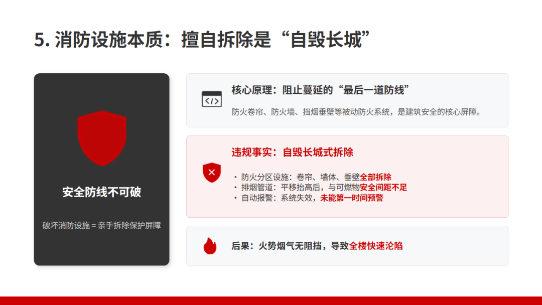 如果说使用不合格材料是埋下隐患,那么擅自拆除消防设施,就是亲手摧毁了保护自己的最后一道防线。防火卷帘、防火墙这些设施,就是建筑的“防火墙”和“防毒面具”,它们的作用就是在火灾初期将火和烟限制在小范围内。而事故公司将这些设施全部拆除,无异于自毁长城,使得火势和烟气能够毫无阻碍地迅速蔓延至整个建筑,最终导致了灾难性的后果。