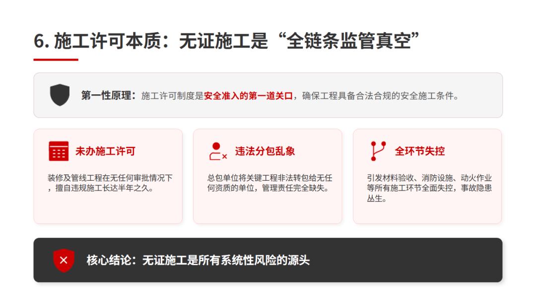 施工许可制度,本质上是政府对工程项目的安全准入审查。它确保了设计、施工、监理等单位具备相应资质,施工方案和安全措施得到审核。事故公司长达半年的无证施工,意味着所有这些安全准入环节都处于真空状态。这就导致了后续一系列问题的发生:违法分包、使用不合格材料、拆除消防设施、违规动火作业。可以说,无证施工是这起事故所有系统性风险的总根源。