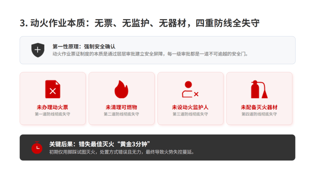 动火作业是高风险作业,必须严格执行票证制度。这个制度的核心,就是通过层层审批,强制确认所有安全措施都已到位。然而在这起事故中,我们看到的是四重防线的全面失守:没有动火票,没有清理可燃物,没有设置监护人,也没有配备灭火器材。当最初发现火情时,作业人员只能用脚去踩,这不仅无效,更错失了宝贵的黄金扑救时间,导致小火演变成大灾。