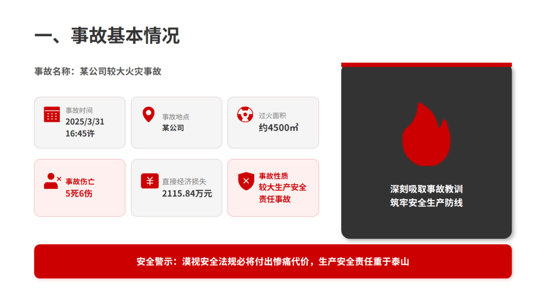 首先,我们来看一下这起事故的基本情况。事故发生在2025年3月31日,地点是某公司的一个在建项目。这起事故最终导致了5人死亡、6人受伤,过火面积达到4500平方米,直接经济损失超过2100万元。经过官方调查,认定这是一起较大生产安全责任事故。这些冰冷的数字背后,是五个家庭的破碎和深刻的安全警示。