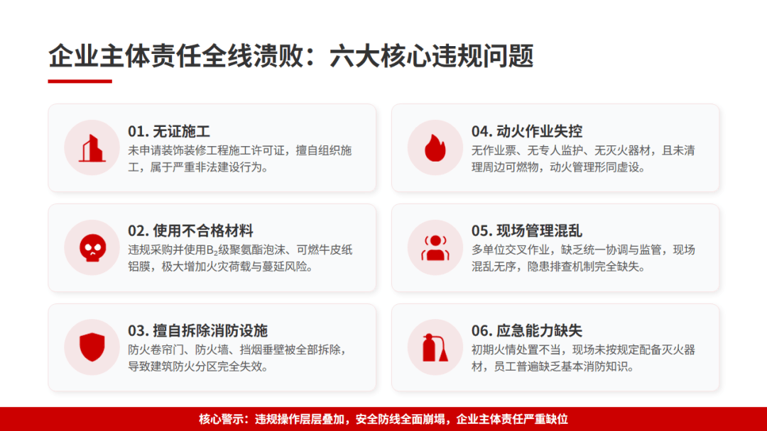 首先,事故的直接责任方,其主体责任可以说是全线溃败。从无证施工开始,到使用不合格材料,再到擅自拆除消防设施,每一步都在挑战安全的底线。动火作业的管理形同虚设,现场管理混乱不堪,应急能力更是为零。这一系列的违规操作,最终酿成了悲剧。