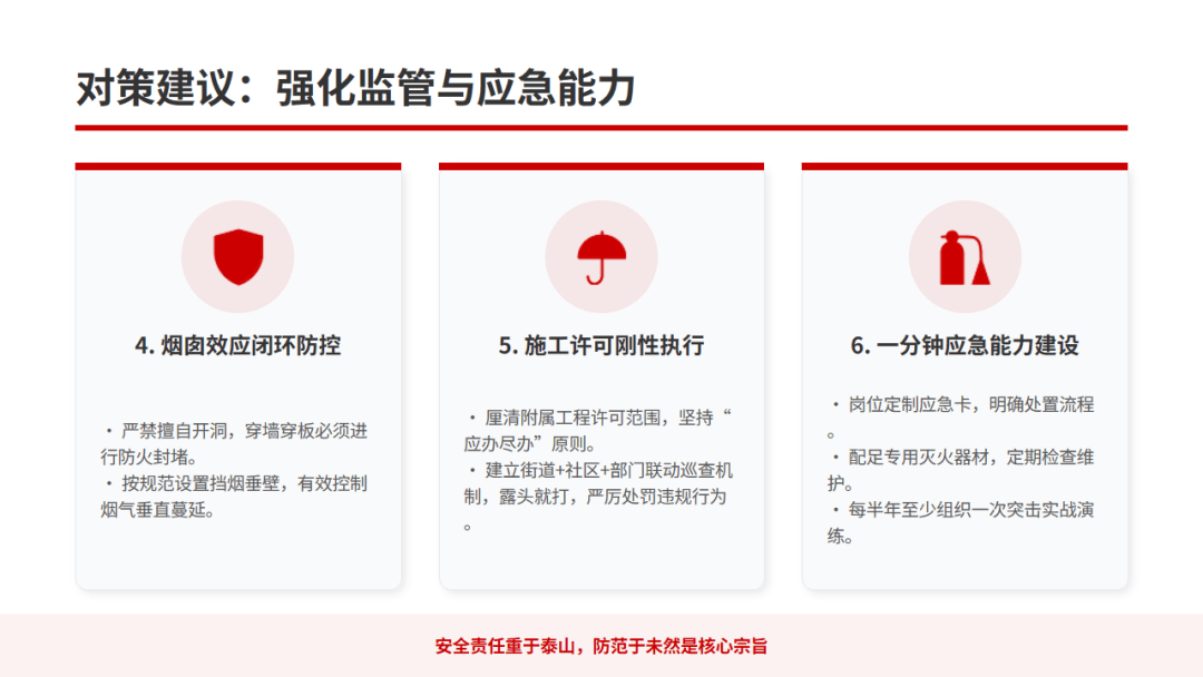此外,我们还需要做好三个方面的工作。一是通过严格的防火封堵和挡烟设施设置,实现对烟囱效应的闭环防控。二是刚性执行施工许可制度,通过多部门联动巡查,严厉打击无证施工行为。三是大力加强企业的初期火灾处置能力建设,通过配备器材、制作应急卡、开展实战演练等方式,确保每个员工都具备“一分钟应急处置”的能力。
