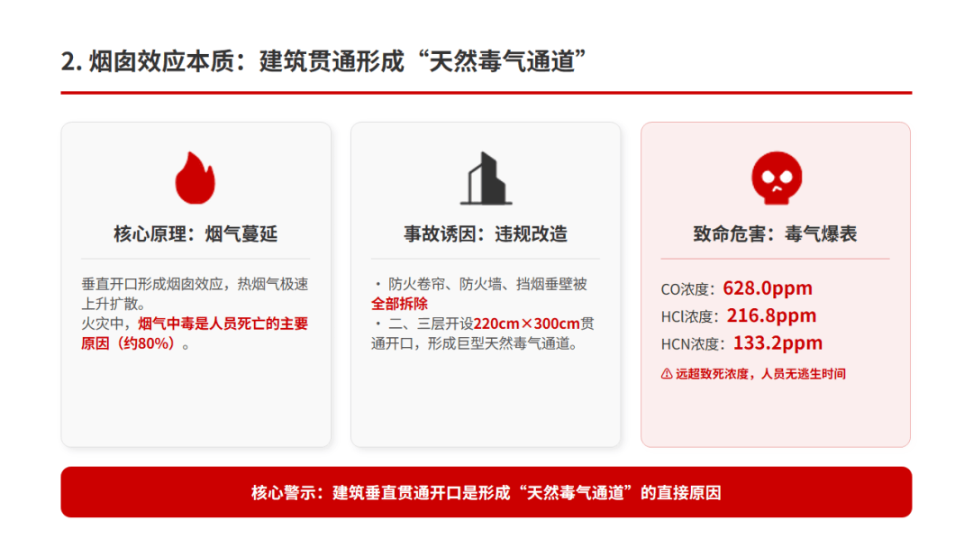 火灾发生后,真正的杀手往往不是火焰本身,而是有毒烟气。这就是烟囱效应的恐怖之处。当建筑存在垂直贯通的开口时,热烟气会像烟囱一样迅速上升并充满整个建筑。在这起事故中,由于防火设施被全部拆除,楼板被擅自开洞,形成了一个巨大的天然毒气通道。聚氨酯泡沫燃烧产生的剧毒气体,如氰化氢,浓度高达133.2ppm,远超致死量。这使得现场人员在极短时间内中毒死亡,根本没有逃生的机会。