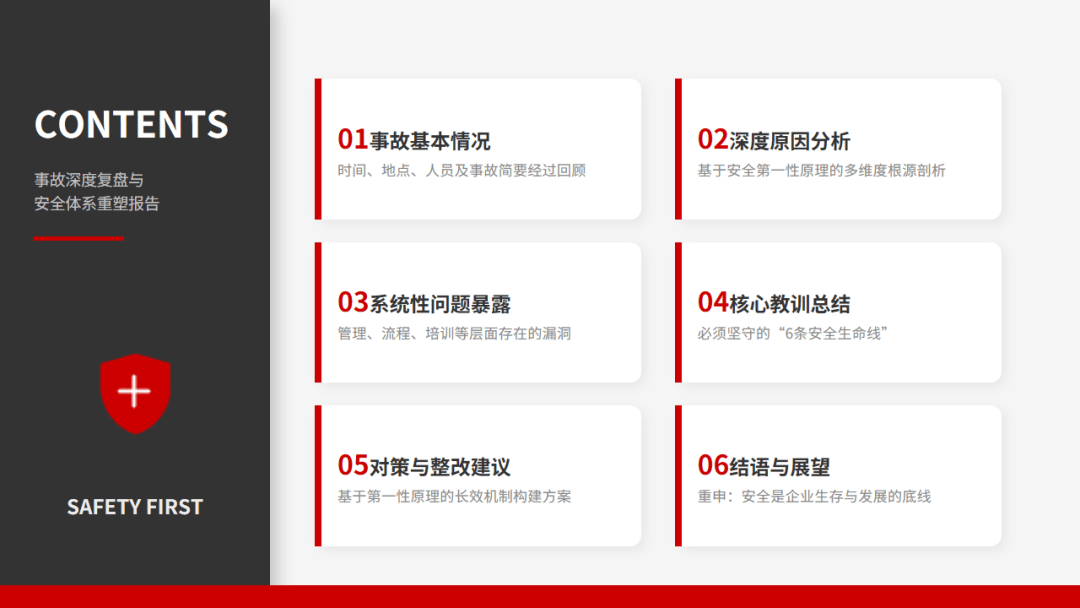 本次报告将分为六个部分。首先,我们将回顾事故的基本情况,包括时间、地点和简要经过。接着,也是本次报告的核心,我们将运用安全第一性原理对事故进行深度剖析,找出问题的根源。然后,我们会总结事故暴露出的系统性问题,涵盖管理、流程和培训等方面。在此基础上,提炼出六条必须坚守的核心教训,即我们的“安全生命线”。随后,我们将提出基于第一性原理的对策建议,确保整改措施的有效性和长效性。最后,我们将以一段结语收尾,再次强调安全是企业生存与发展的底线,不容触碰。