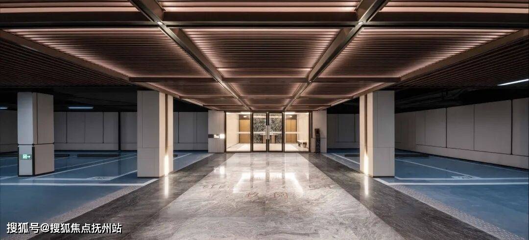 地库车马厅采用“天地墙一体化”精装设计:顶部是秩序井然的定制藻井格栅,地面铺设天然石材,单元标识采用温润的透光云石,就连门把手也选用了质感厚重的云石,营造更具仪式感的归家体验。