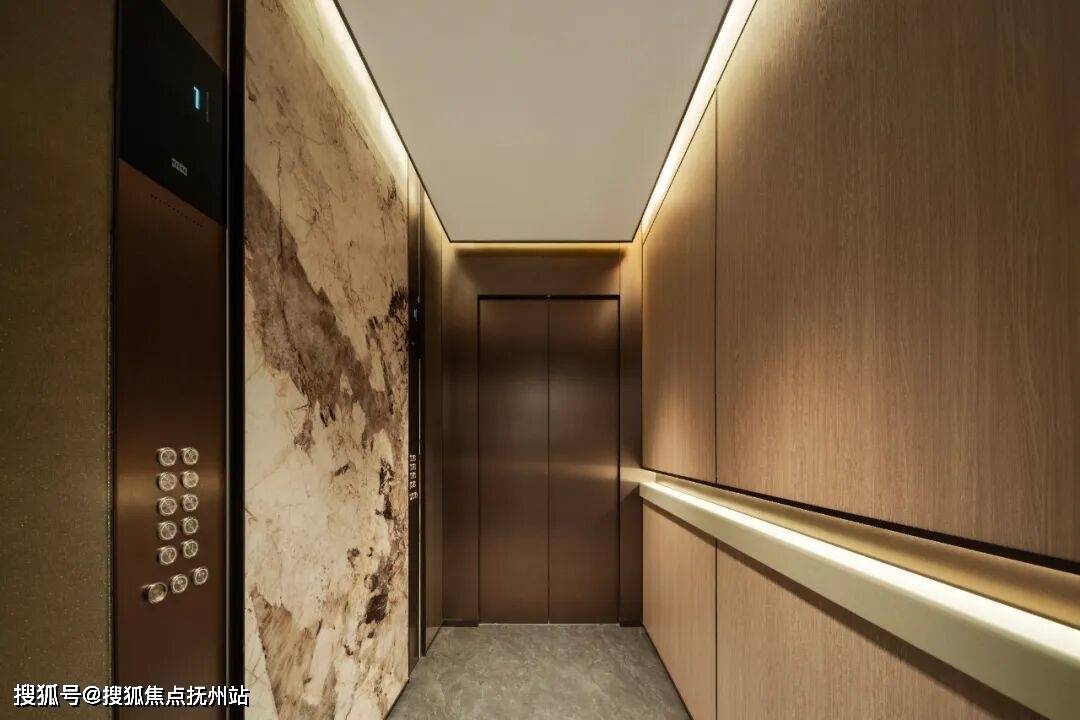 电梯厅内,皮革、木饰面、金属与岩板等多种材质精巧搭配,细节之处无不彰显对品质的苛求。