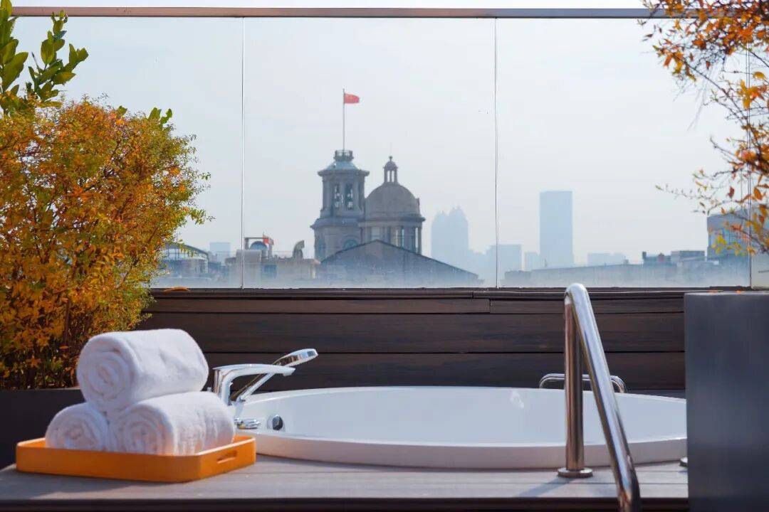 这间套房的最大特色非露台莫属了,超大的景观露台上不仅可以用餐,甚至还能泡澡!朝向江汉关的绝佳角度,甚至能看到一些江景,让这间套房的风貌特色绝无仅有。