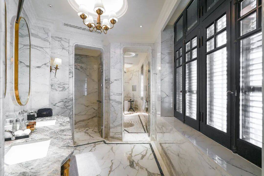 客房内的家具自带高级复古格调,灯饰、地毯等细节完美融合传统与浪漫风情,从Marshall的蓝牙音响、Karl Lagerfeld洗护备品,到Voss饮用水、店制的青砖茶饮料、精致的欢迎礼,注入现代奢华舒适感,呈现新旧交融的韵味,都在传递“这是属于巴公邸的尊贵”。