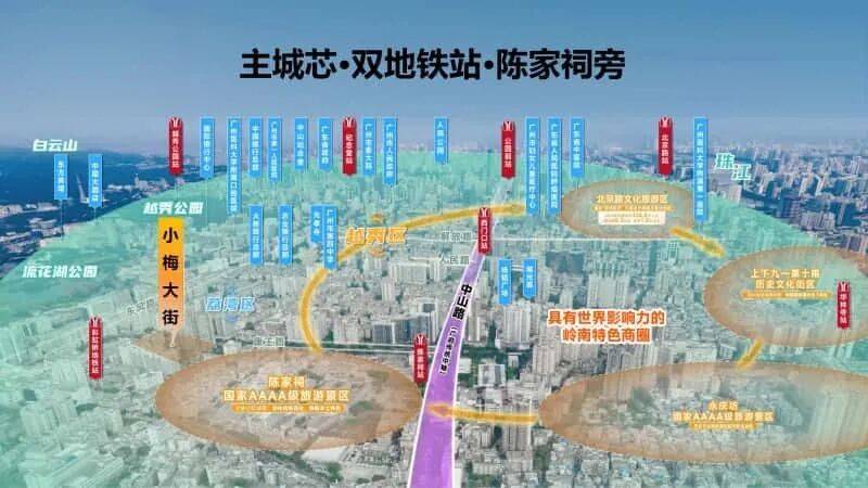 答:项目步行即可到达陈家祠站(一号线、八号线)和彩虹桥站(十一号线、十三号线、二十二号线在建),双地铁枢纽确保出行便利。